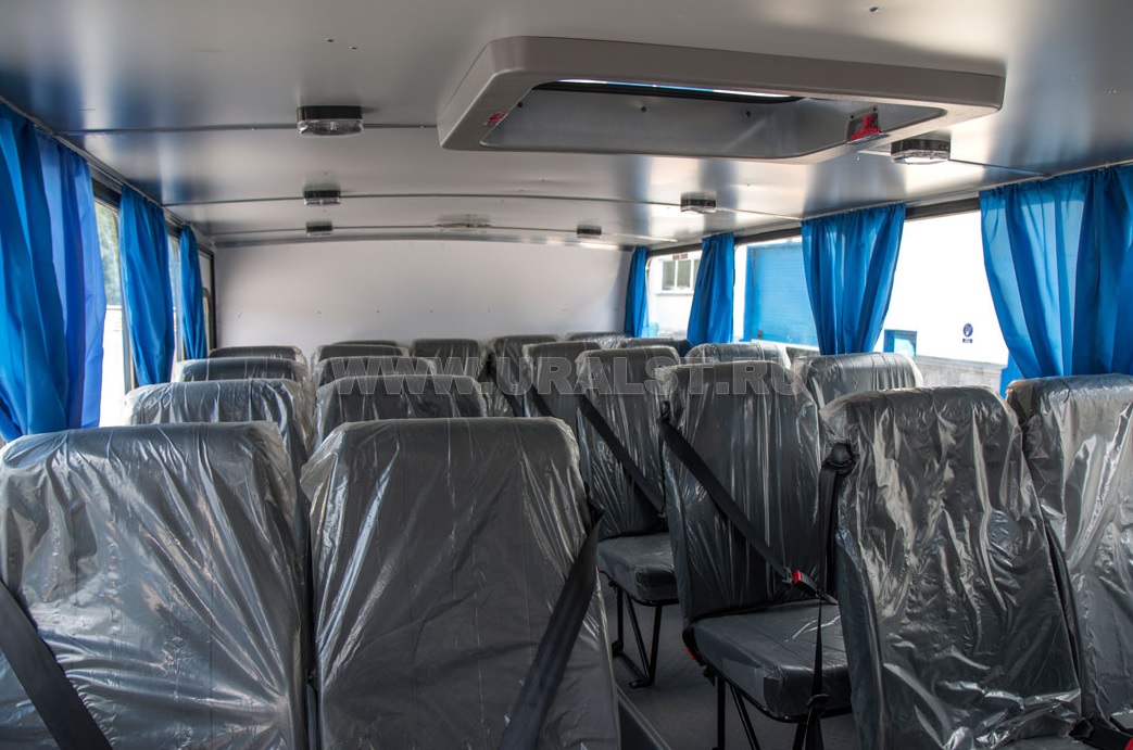 Вахтовый автобус рассчитан на перевозку бригады из 22 человек. Салон оборудован двухместными сиденьями с ремнями безопасности. Для входа в салон вахтового автобуса используется откидная лестница.
