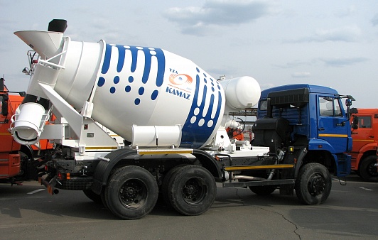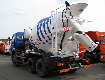 Привод смесительного барабана осуществляется от двигателя шасси с отбором мощности через КОМ. Привод от двигателя шасси значительно улучшает экономические (снижаются расходы топлива, масса технологического оборудования, трудозатраты на техобслуживание), экологические (снижаются выбросы вредных веществ) и эргономические показатели (снижен уровень шума).