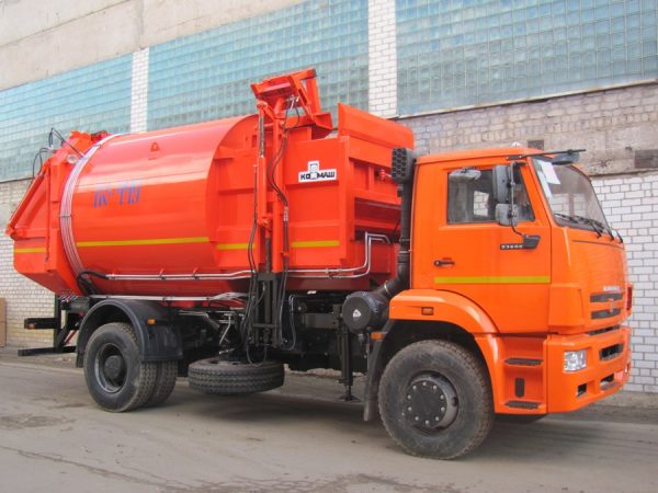 Цилиндрический кузов имеет прямоугольную приемную камеру с прессующей плитой. Уменьшенное