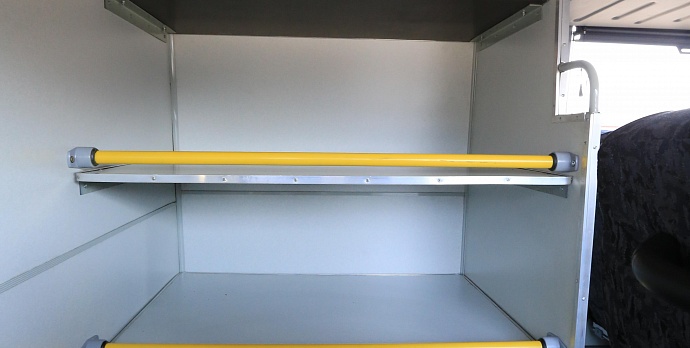 Кузов закрытый фургонного типа, каркасной конструкции с термоизоляцией, в правой боковине снабжен двумя дверями, одна из них аварийная; с отгороженным багажным отделением с полками; запасное колесо установлено по центру задней стенки, увеличенный проход по высоте до 1950 мм.
