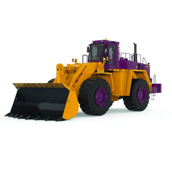 Погрузочное оборудование состоит из рабочего органа – ковша универсального или скального и рычажной системы. Режущая кромка универсального ковша прямая и образована 5 ножами, крепящимися болтами. Режущая кромка скального ковша – лопатообразная и образована восемью приваренными зубьями и надетыми на них наконечниками и ножами в промежутках между зубьями, которые могут крепиться болтами или привариваться. Рычажная система обеспечивает подъем, опускание и поворот ковша. Стрела одним концом крепится осями к проушинам передней полурамы, к другому концу прикреплен ковш. Подъем и опускание стрелы производится при помощи двух гидроцилиндров, закрепленных на передней полураме, а поворот ковша производится гидроцилиндром, установленным между стрелой и коромыслом.